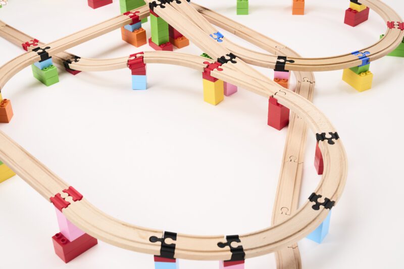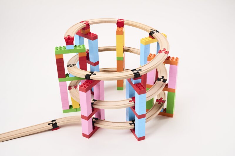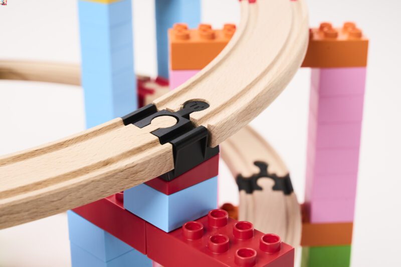 With the BiOBUDDi track connectors made from BIO-material (BiOBUDDi) and in combination with building blocks such as LEGO DUPLO or BiOBUDDi, children’s creativity and imagination are put to the test. Children can now build complex railways, even vertically. This set contains 100 pieces.