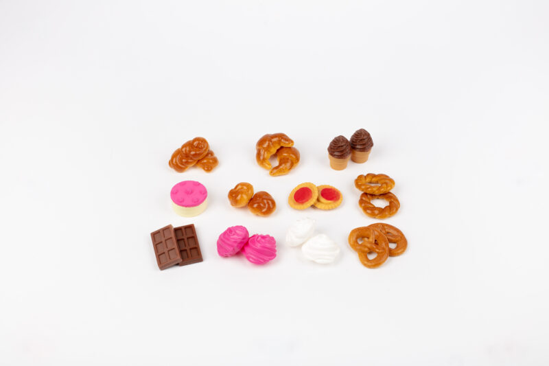 A set of assorted small sweets made from durable and washable plastic. This toy is suitable for a childcare center or classroom. Age 2 years. Includes 22 pieces. The foam cake has a diameter of 4.5 centimeters and the chocolate bar is 7 centimeters long. Made from 100 percent recyclable material, containing 50 percent recycled content and produced with renewable energy.