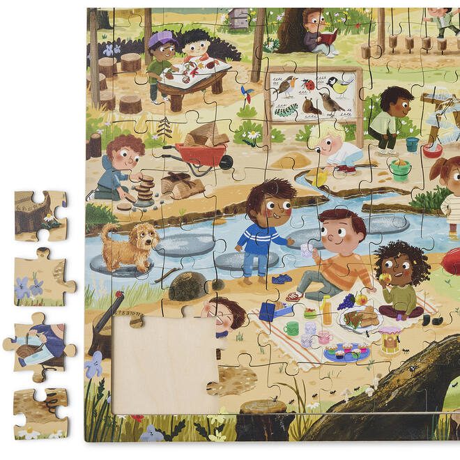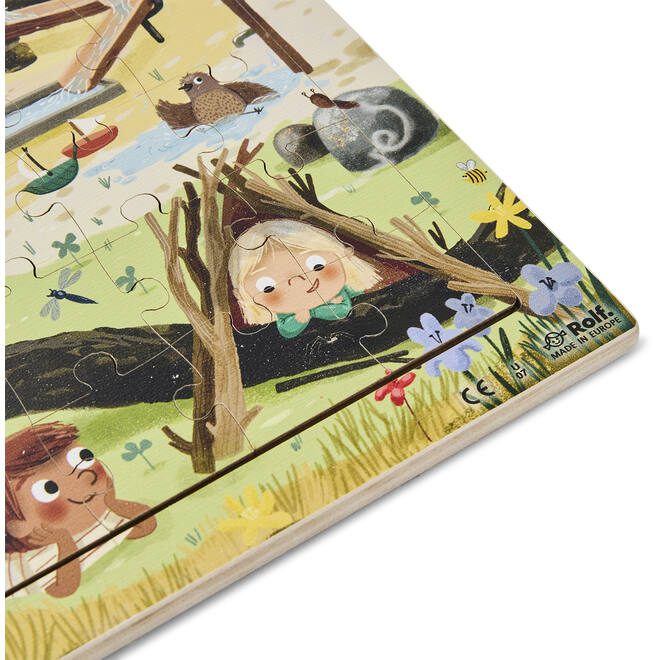 Puzzle and play on the nature playground. While puzzling, meet the children on the board and discover everything there is to do at this playground. Look for the animals, the watercourse, the chain reaction, the sundial, and the delightful picnic. Size: 50 x 40 cm ; 120 puzzle pieces