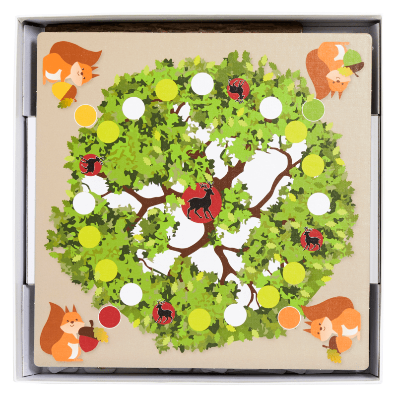 In this game the squirrels have to collect acorns in their chosen colour and put them on their acorn collection card ( 1-10 ).They have to use a dice and they will find all kind of challenges on their way :- When the squirrel arrives on a green circle he can collect acorns.- When the squirrel arrives on a green circle he will lose acorns.- When the squirrel arrives on a white circle, no action for the squirrel.The one who collected 10 acorns first is the winner of the game.Content:- 1 gameboard- 4 acorn collection cards- 40 acorns in 4 different colours: red, yellow, orange and green- 4 pawns- 1 wooden dice 1-3- manualAge: 4+ , 2-4 players