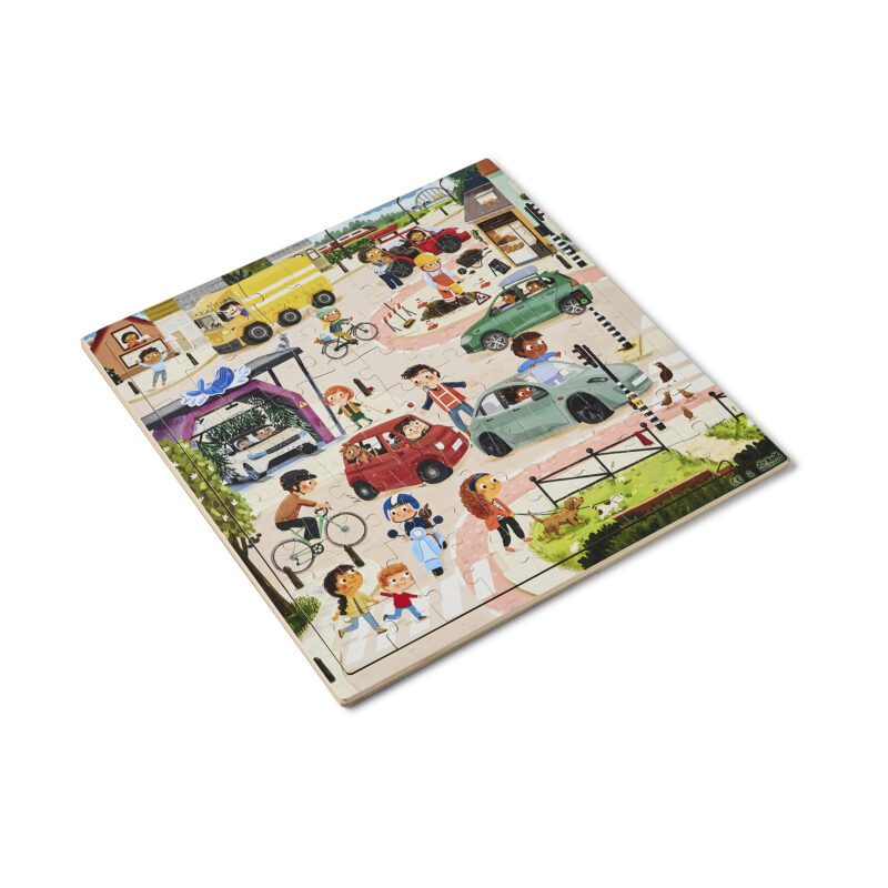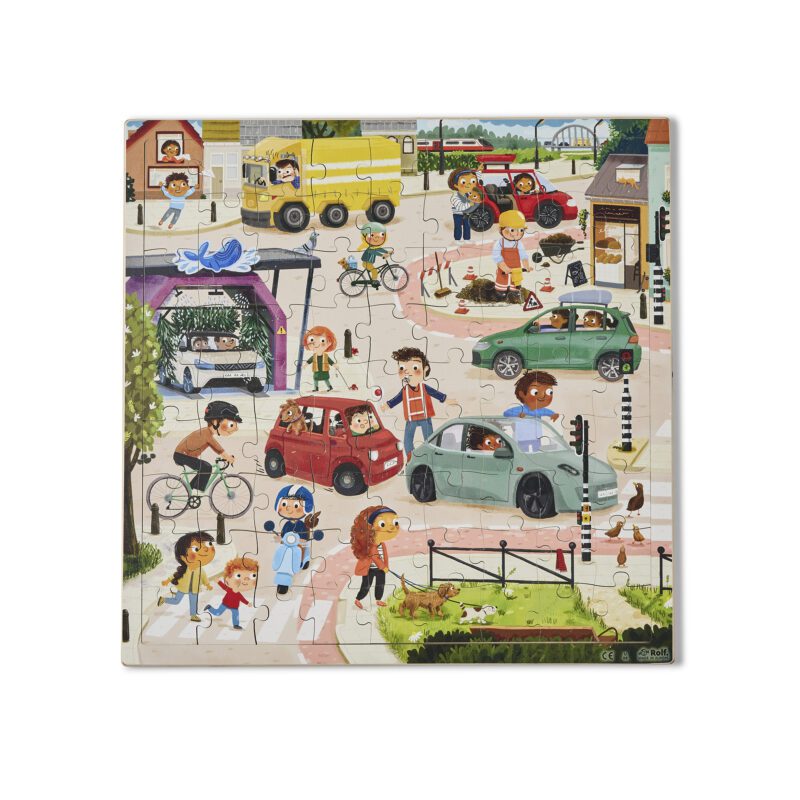 With this AR puzzle, children recognize different elements in traffic. They see the image on the puzzle, a photo of the real world, and the sound of, for example: a bicycle bell, a car wash, the train, or a car. Scan the images with the Rolf Sounds app, view the photo on a mobile device, and listen to the sound. The children practice vocabulary, language, and digital skills. Size: 37,5 x 37,5 cm 81 puzzle pieces