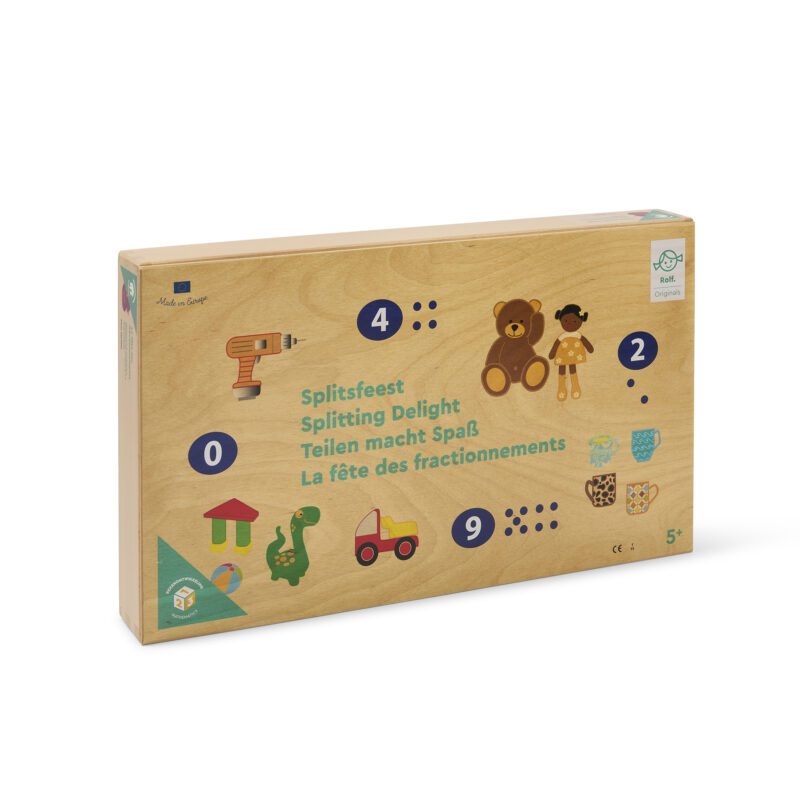 With Splitting Delight children learn and practice splitting numbers from 3 to 12 using split cabinets, a fundamental skill for developing fluent arithmetic. The teacher gives instructions using the back of the lid, which shows a real split cabinet. Then the children take a split cabinet filled with tools, tableware, or toys. They place the quantity cards in the correct spots in the cabinet. Using the tokens, they physically create the split, and then place the correct cards on the cabinet. This way, splitting becomes a fun and engaging activity! Contents: Wooden splitting cupboard (lid), 5 oval splitting cards for the top of the splitting cupboard • 5 splitting cupboards 3 to 12: Splitting cupboards 3, 4, 5 and 6 with toys, Splitting cupboards 7, 8, 9 and 10 with tools–, Splitting cupboards 11 and 12 with cups, 45 quantity/number cards, 50 chips, instructions. Suitable for 2–6 children ages 5 and up.