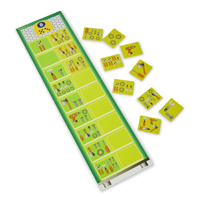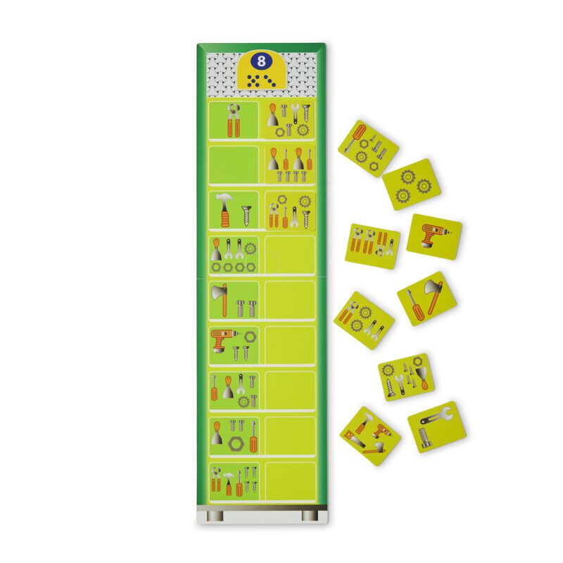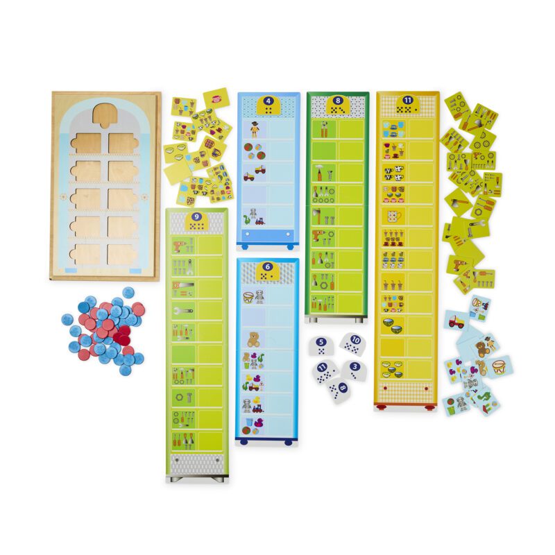With Splitting Delight children learn and practice splitting numbers from 3 to 12 using split cabinets, a fundamental skill for developing fluent arithmetic. The teacher gives instructions using the back of the lid, which shows a real split cabinet. Then the children take a split cabinet filled with tools, tableware, or toys. They place the quantity cards in the correct spots in the cabinet. Using the tokens, they physically create the split, and then place the correct cards on the cabinet. This way, splitting becomes a fun and engaging activity! Contents: Wooden splitting cupboard (lid), 5 oval splitting cards for the top of the splitting cupboard • 5 splitting cupboards 3 to 12: Splitting cupboards 3, 4, 5 and 6 with toys, Splitting cupboards 7, 8, 9 and 10 with tools–, Splitting cupboards 11 and 12 with cups, 45 quantity/number cards, 50 chips, instructions. Suitable for 2–6 children ages 5 and up.